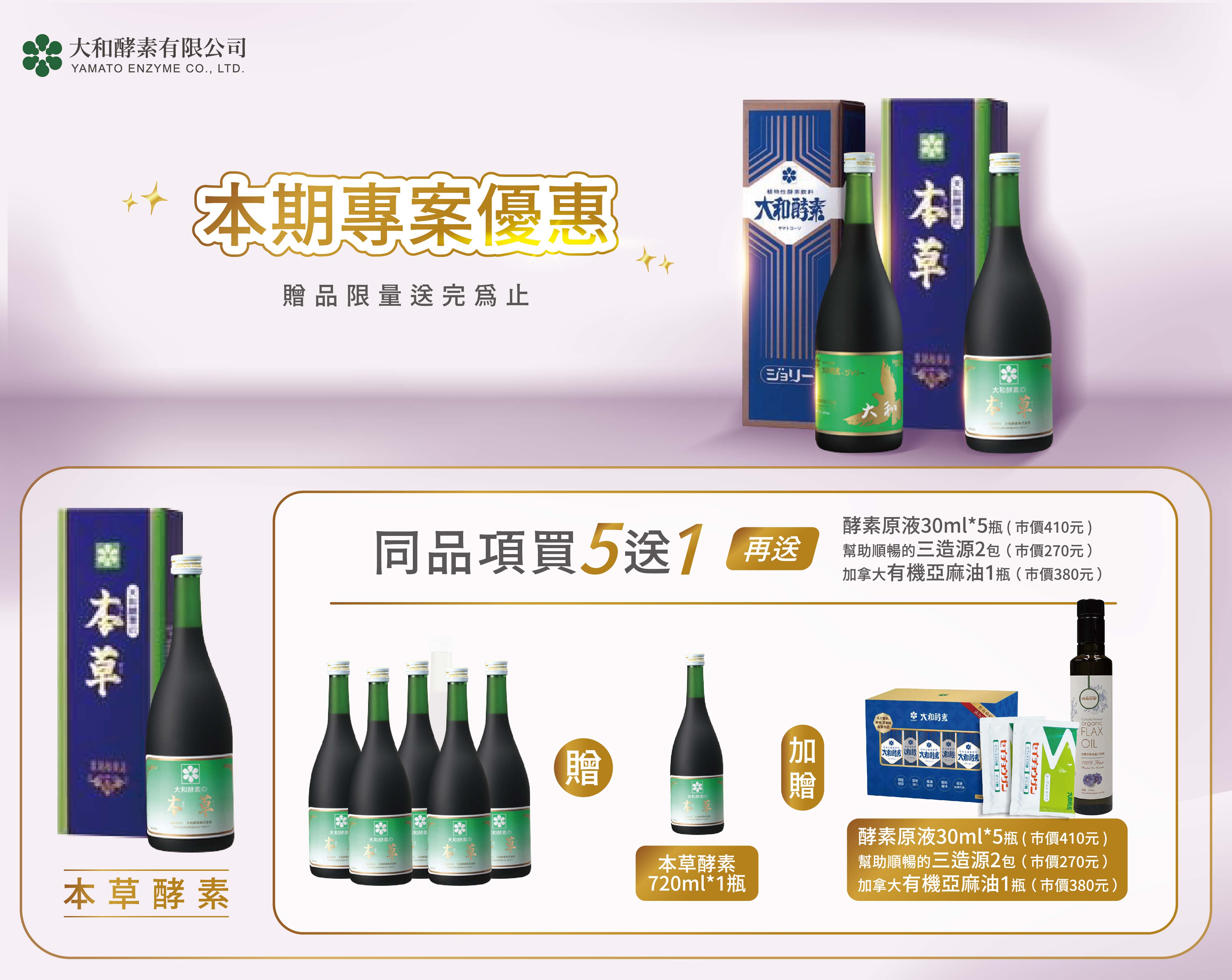 ✿買5瓶送1瓶,再加送酵素原液30ml*5瓶 ( 市價410元 ) 、幫助順暢的三造源2包 ( 市價270元 )、加拿大有機亞麻油1瓶(市價380元)