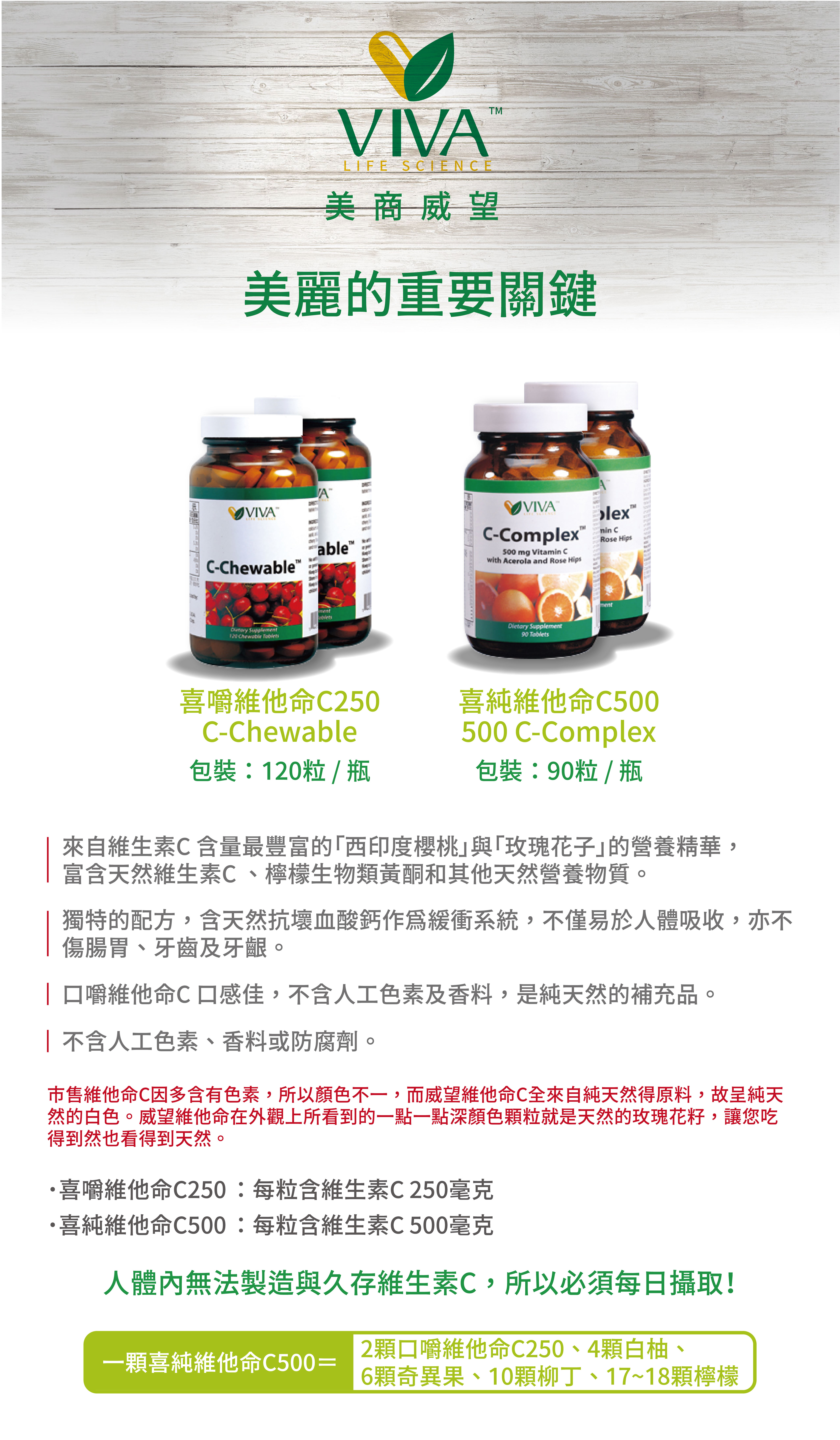 喜嚼維他命C250:每粒含維他命C 250毫克,規格:120粒 / 瓶