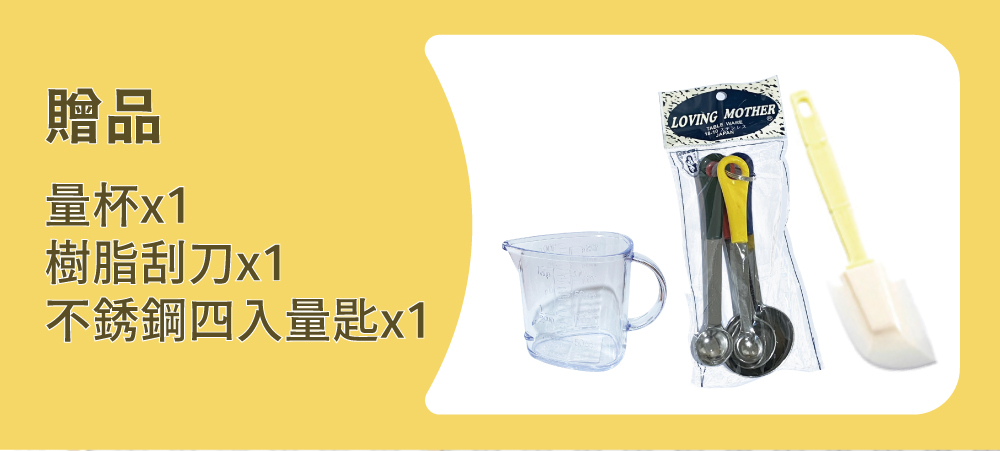 ✿贈品:樹脂刮刀、量杯、不銹鋼四入量匙